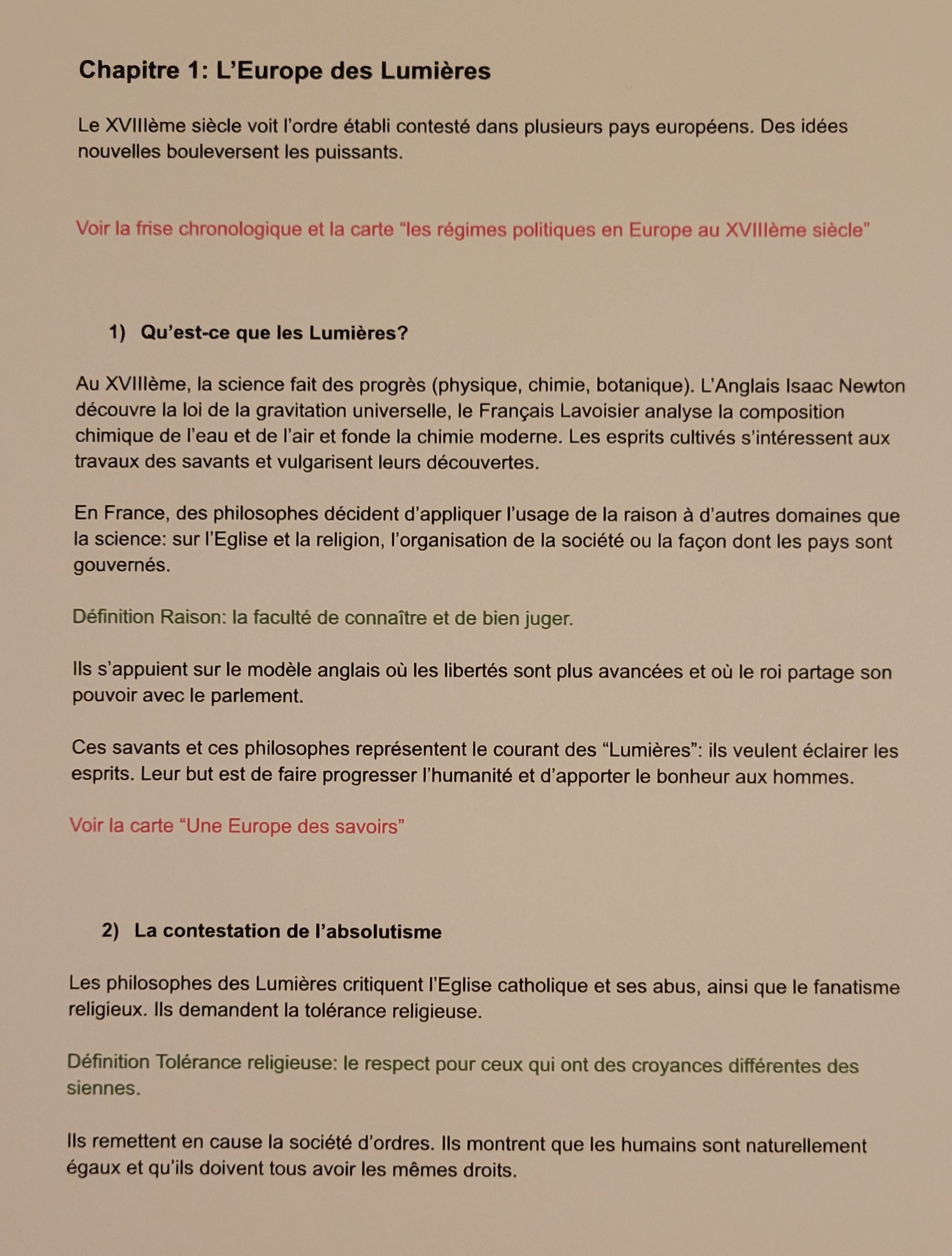 Voici un exemple de page : en noir, les notes à prendre à la main en classe. En rouge, les documents étudiés à l’oral en classe. En vert, les définitions des termes importants.