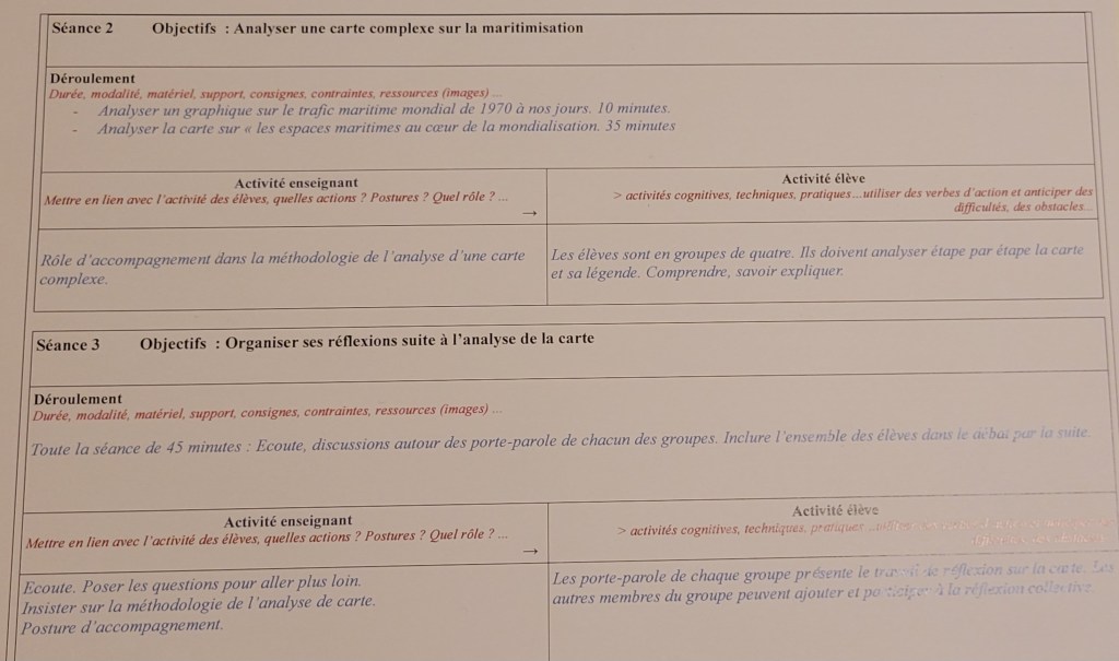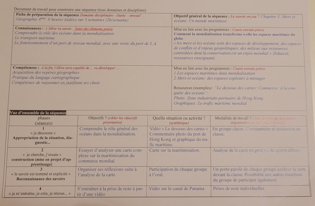C’est ma tutrice pendant cette formation, Camille Salvin, qui a proposé de partager avec moi une méthode de travail simple et claire: une « fiche de préparation de la séquence », qui peut s’appliquer à tout type de discipline et de classe. Un très bon exercice que je peux désormais répéter.