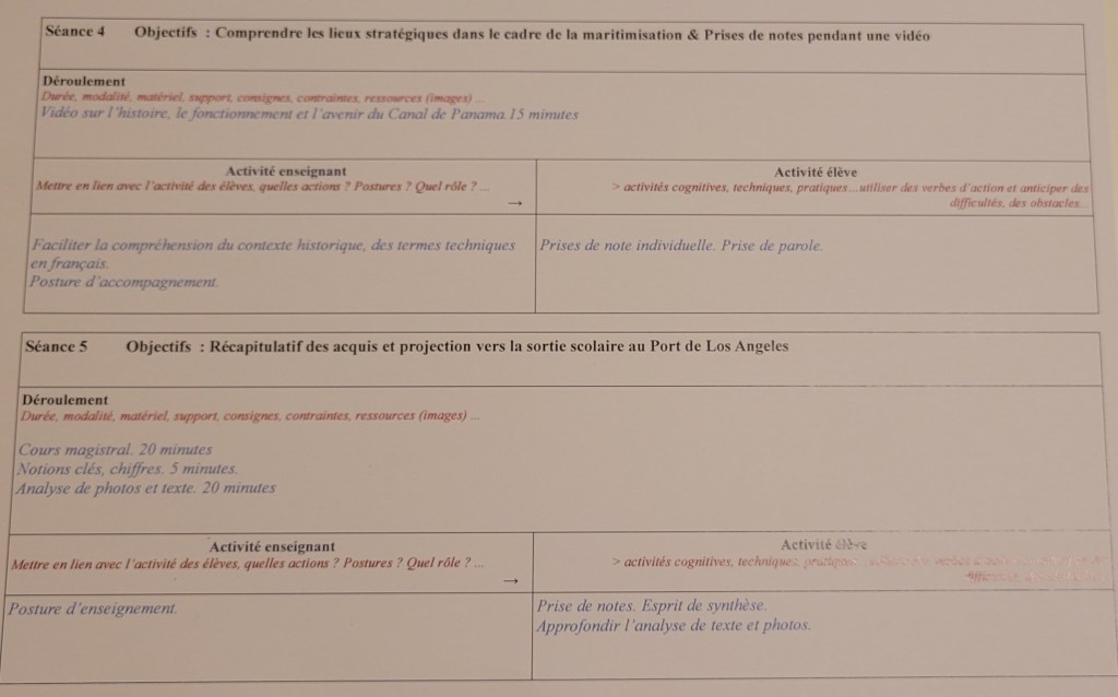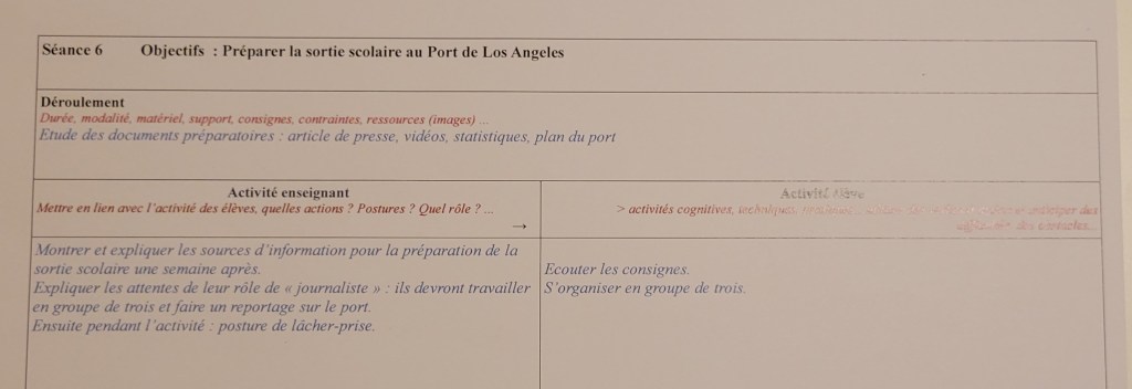 J’ai décidé de l’utiliser pour la première fois pour préparer la séquence de Quatrième liée au chapitre sur la « Maritimisation de l’économie » (en géographie) et en vue d’une sortie scolaire au port de Los Angeles. Voici le cadre: en noir et en rouge, les rubriques et les conseils. En bleu, ce que j’ai ajouté.