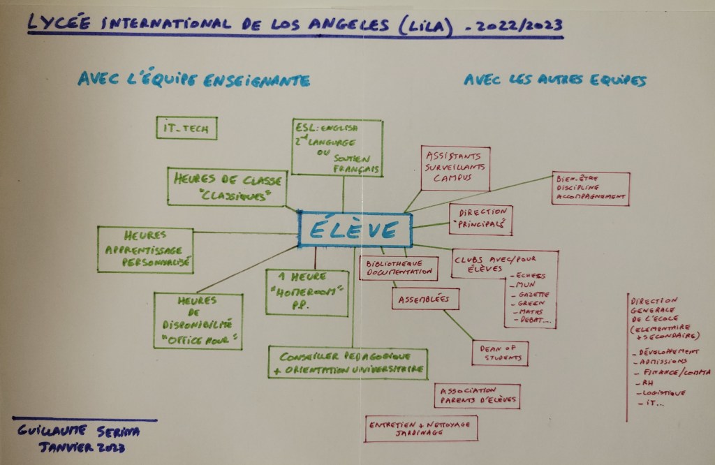 Placer l’élève au coeur de notre métier d’éducateurs et d’enseignants: voilà l’unique façon de remplir la mission affichée plus haut tout en respectant nos valeurs! Ci-dessous, le schéma préparé en janvier 2003 dans le cadre de notre formation. Il est imparfait, mais j’ai voulu restituer ici ma vision d’origine sur le rôle tenu par toutes les équipes de notre établissement: de l’équipe enseignante aux surveillants, du personnel d’entretien à la direction des admissions, en passant par les comptables, la bibliothécaire, les responsables de la vie scolaire ou encore l’association de parents d’élèves.